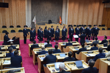 新議場で演奏を披露する県立橘高校合唱部=9日、福島市 福島県議会は、完成した新議場で初めてとなる12月定例会の開会日に合わせて、議場開場記念行事を行った。県立橘高校の合唱部が本会議を見学した後、演奏を披露した。