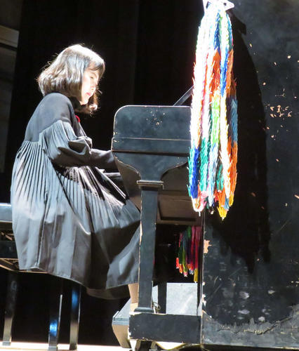 この日のために、80年前の原爆投下時に被爆したピアノを広島から運んできた。「千羽鶴」「Believe」などを弾き語りした佐藤は「私は新潟県出身なのですが、長岡市に長岡花火があります。8月2、3日に平和や慰霊、鎮魂の気持ちを込めて行っています」などと故郷のイベントを紹介。「私は目が見えませんが、五感のうち、目以外の四感を使って平和のことや自然のことを感じています」などと話した。