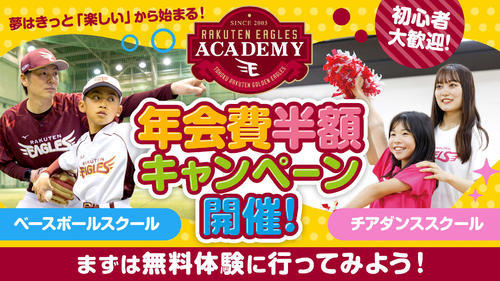 楽天イーグルスアカデミー ベースボールスクールとチアダンススクールでは、12月22日(月)午後5時30分までに新規入会手続きを完了し、入会から3か月以上継続して受講いただける方を対象に、年会費が半額になるお得なキャンペーンを開催しています。