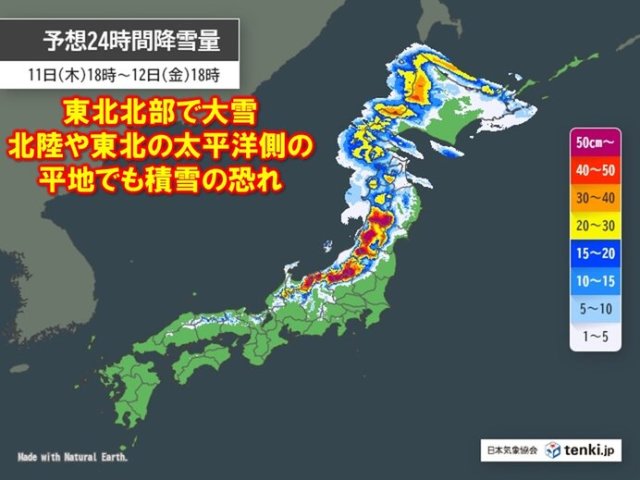 東北北部では特に雪が強まり、24時間最大で60センチ(11日6時〜12日6時)、さらに50センチ(12日6時〜13日6時)の降雪が予想されています。