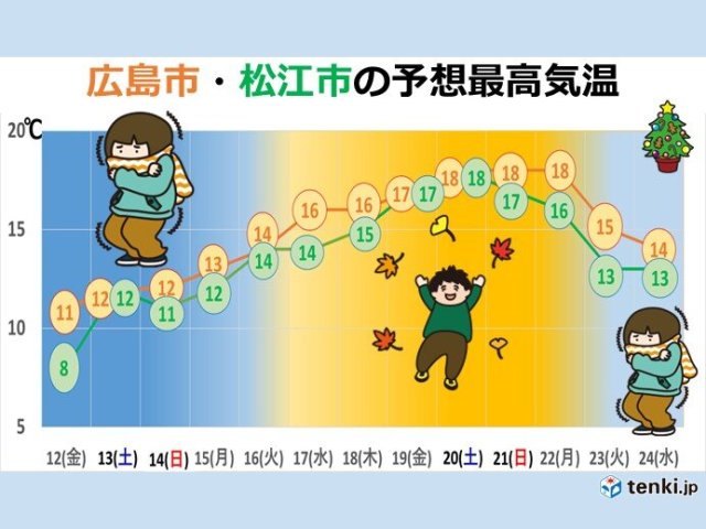 明日12日(金)は一時的に強い寒気が流れ込むため、中国地方は日本海側で雨や雪が降り、真冬並みの寒さになるでしょう。今日11日(木)よりも大幅に気温が低くなる見込みです。また、この先は週明け15日(月)にかけては雨や雪の降る日が多く寒いですが、来週末は20℃近くになり、季節外れの暖かさとなるでしょう。大掃除日和となりそうです。寒暖差が大きいため、体調を崩さないようご注意ください。