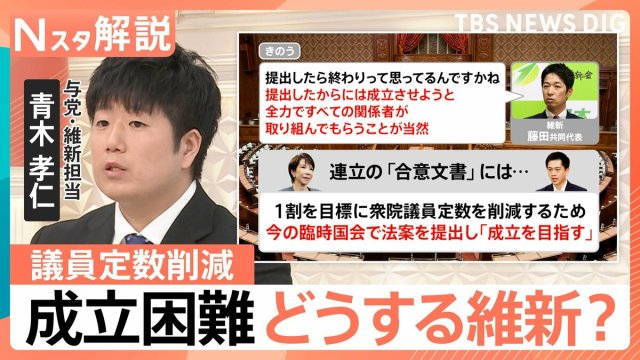 自民と維新が連立を組む際、「議員定数の削減」はマストだったのではないかというところですが、自民・維新の連立の合意文書には「『1割を目標に』衆院議員定数を削減するため、今の臨時国会で法案を提出し『成立を目指す』」とされています。