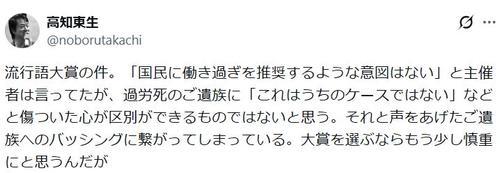 高知は「流行語大賞の件。『国民に働き過ぎを推奨するような意図はない』と主催者は言ってたが、過労死のご遺族に『これはうちのケースではない』などと傷ついた心が区別ができるものではないと思う」と書き出した。続けて「それと声をあげたご遺族へのバッシングに繋がってしまっている。大賞を選ぶならもう少し慎重にと思うんだが」とつづった。