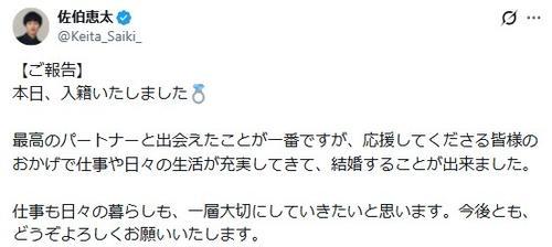 佐伯は「【ご報告】本日、入籍いたしました」とウェディングドレス姿のお相手とのツーショットを公開。「最高のパートナーと出会えたことが一番ですが、応援してくださる皆様のおかげで仕事や日々の生活が充実してきて、結婚することが出来ました」とつづり、「仕事も日々の暮らしも、一層大切にしていきたいと思います。今後とも、どうぞよろしくお願いいたします」と呼びかけた。