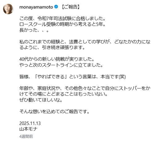 山本は先月、自身のインスタグラムで司法試験に合格したことを報告。3人の子ども育てながらの勉強について「家で子供がいる時は出来ないんです。どんなに子どもがテレビ見ててもやっぱりそばにいると気になっちゃってできないから、子どもが起きている時間はしないって決めて。家でやる場合は、子どもが寝た後か起きる前」と振り返った。