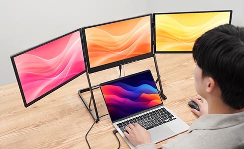 USB Type-Cおよびmini HDMI接続に対応した外付け型ディスプレイで、15.6型フルHDパネル×3面を搭載。USBディスプレイ機能を内蔵しており、映像出力に対応しないUSBポートに接続可能となっているのが特徴で、PC本体+外付け3面の計4画面構成を手軽に構成できる。
