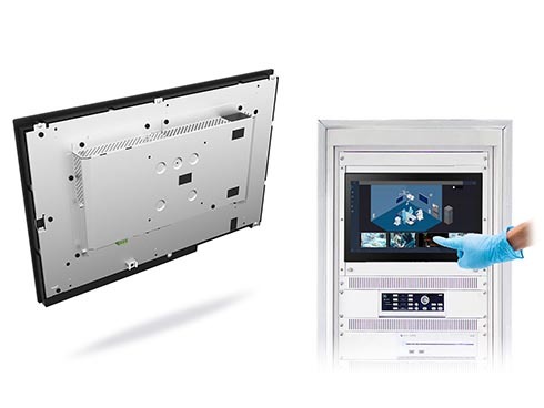 産業機械などへの組み込みが可能なオープンフレームを採用した18.5型液晶ディスプレイで、別売金具の利用により19インチラックマウントへの取り付けにも対応した。