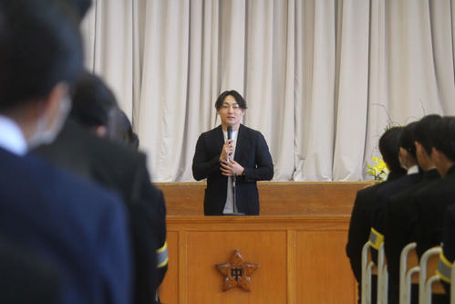 同校の鈴木克則校長が千葉県立勝浦中時代に3年間担任した恩師で、依頼を快諾。全校生徒340人と保護者の前で、「今、中学生に伝えたいこと」をテーマに「無限の可能性がある。僕は運良く、中学の時から野球選手になりたいという目標があって、そこに全力投球できました。いま目標がない子もいるかもしれませんが、絶対にでてくる。その時に自分で考えて、どうしたらいいのか。自分で考えて行動できるように準備してほしい」と語りかけた。