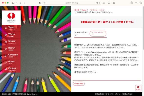 アニメ制作会社の旭プロダクションは12月10日、2015年放送のテレビアニメ「温泉妖精ハコネちゃん」の公式サイトを装った偽サイトを確認したとして注意喚起した。URLは旧公式サイトのままのため、手放したドメインを第三者が取得し、悪用されるドロップキャッチの事例とみられる。