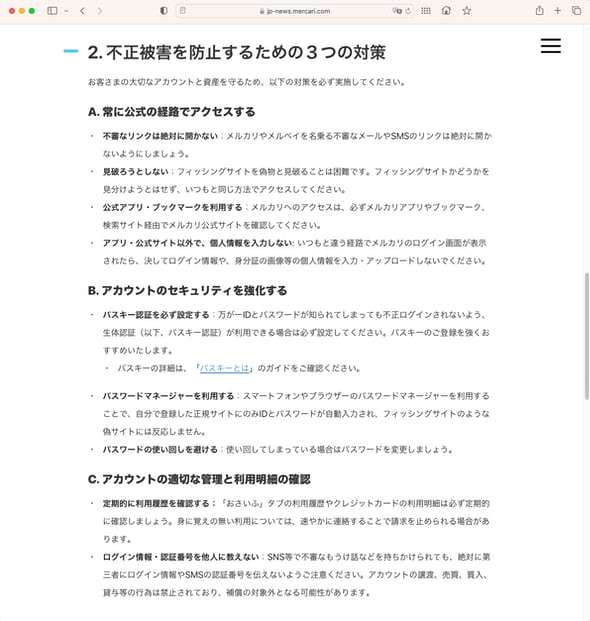 メルカリは対策として、メルカリへのアクセスは公式アプリやブックマークなどを用いて、メルカリやメルペイを名乗る不審なメールやSMSのリンクを開かないように求めている。「フィッシングサイトを偽物と見破ることは困難。見分けようとはせず、いつもと同じ方法でアクセスしてほしい」。