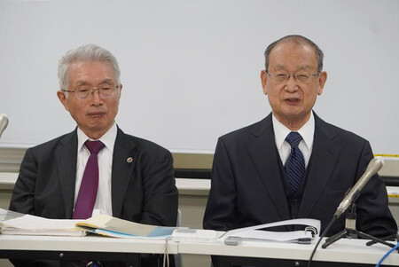 無罪判決を受けて記者会見する平田恒一郎被告(右)。左は弘中惇一郎弁護士=15日午後、横浜市 住宅関連会社「ナイス」(旧すてきナイスグループ)の粉飾決算事件で、金融商品取引法違反(有価証券報告書の虚偽記載)罪に問われた元会長平田恒一郎被告(77)と元社長日暮清被告(74)の差し戻し審判決で、横浜地裁(佐藤卓生裁判長)は15日、無罪を言い渡した。平田被告は懲役2年6月、日暮被告は同1年6月を求刑されていた。