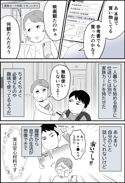 参考書でも買ったのかな、映画は何を観たのだろう。カードの使用履歴から垣間見える息子の生活。成長し、自分のことを語らなくなっていくけれど、カードの使用履歴が安心材料になる……のでしょうか。カード契約者として使用履歴のチェックは当然ですが、子どもに内緒でこっそり監視するのはダメですよ〜(笑)?