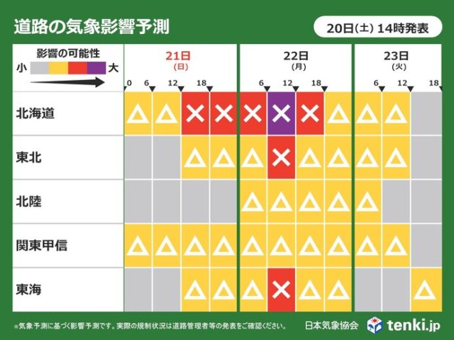道路の気象影響予測の図を見ると、明日21日(日)〜23日(火)にかけて影響を受ける所が多く、22日(月)は全国的に影響を受ける見通しです。特に北海道では21日午後から22日の日中いっぱいは影響が大きくなるでしょう。