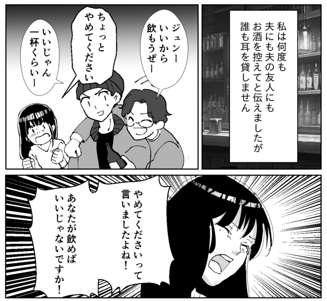 私は夫にお酒を控えるよう何度も声をかけました。夫の友人たちにも「勧めないでほしい」と伝えましたが、誰も耳を貸してくれません。私は思わず声を張り上げてしまいます。