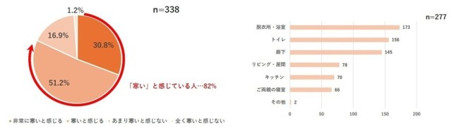 また、特に寒いと感じる場所を聞くと「脱衣所・浴室」(173名)、「トイレ」(156名)、「廊下」(145名)と、ヒートショックが起こりやすいとされている場所が上位に。さらに、「ご両親がご実家で生活する中の行動で、ヒートショックなどの健康被害が起きないか不安を感じますか?」と質問したところ、9割以上の人が「非常に感じる」(45.5%)、「感じる」(47.3%)と回答した。