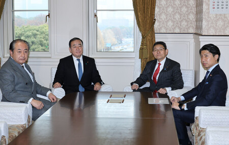 会談に臨む自民党の梶山弘志国対委員長(中央左)と立憲民主党の笠浩史国対委員長(同右)=25日午後、国会内 自民党の梶山弘志国対委員長は25日、立憲民主党の笠浩史国対委員長と国会内で会談し、通常国会を来年1月23日に召集する政府の方針を伝えた。会期は6月21日までの150日間。高市早苗首相の就任後初めてとなる施政方針演説が召集日に行われ、これに対する各党代表質問から論戦に入る見通しだ。
