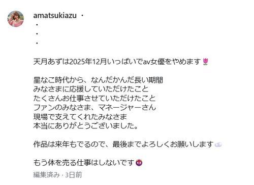 バニーガールのコスプレ写真を公開した上で「天月あずは2025年12月いっぱいでav女優をやめます」と書き出した。