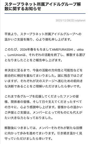 改めまして、これまでの長きにわたりAMEFURASSHI、ukka、LumiUnionへのご声援とご支援に心より御礼申し上げますとともに、引き続き各メンバーの今後の活動、スタープラネットに変わらぬご支援を賜りますよう、何卒よろしくお願い申し上げます。