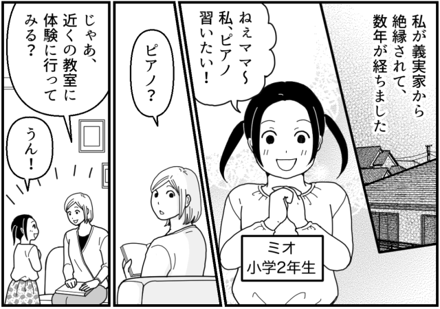 ミオが義母に話すと、義母が知り合いのプロの方に個人レッスンを頼んだようです。ミオは平日、学童へ行っているので、ピアノは土曜に入れるつもりでした。けれど……義実家から通うとなると、必然的に毎週義実家に行くことになります。