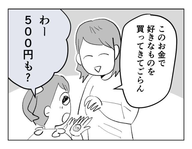 大量に交換してしまったぷっくりシールの価値をちゃんと理解してもらうべく、娘に渡した500円。シールがたくさん売っている雑貨屋の前で放つというのはユイさんなかなかの策士……だと思ったのですが、なぜだかミノリちゃんは雑貨屋へ向かいません。「シールを買う」と言ったのに……? 他に500円をもって行きたい場所があるのでしょう。子どもは親の思い通りにはいきませんね。