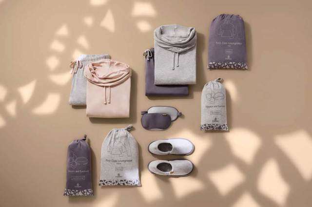 一部の長距離路線で、モーダル素材を使用したラウンジウェアを用意する。持続可能な方法で栽培されたブナの木から採取された植物繊維を使い、通気性や軽やかな着心地が特徴。快適な睡眠に最適な温度調整機能も備える。女性向けはブラッシュピンクとライトグレー、男性向けはツートングレーが貴重で、それぞれおそろいのスリッパとアイマスクもセットになっている。