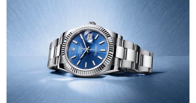 ロレックスの「デイトジャスト 41」は、王道の高級時計として多くの人から支持されるモデルだ。文字盤にはいくつかのカラーバリエーションが存在するが、ブライトブルーの文字盤はサンレイ仕上げによって、光を受けて揺らめくような表情を見せる。
