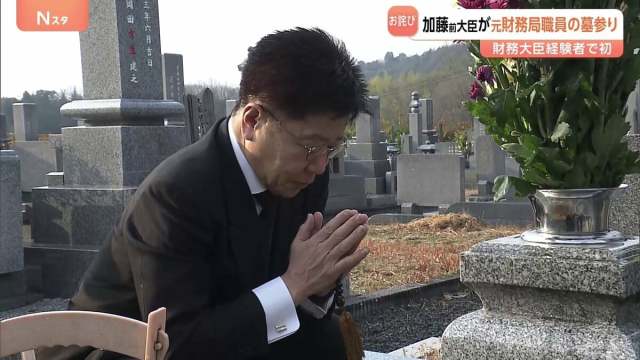 森友学園の決裁文書をめぐる改ざん問題で自殺した近畿財務局元職員の墓を加藤前財務大臣が訪れました。財務大臣経験者による墓参りは初めてです。