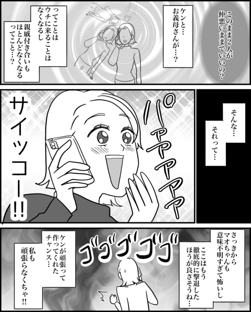 夫は私たちの平穏な暮らしを守るため、頑張って義母と闘ってくれました。それは本当に嬉しかったです。なのにここで私が変に遠慮してしまったら、すべてが水の泡。非常識な義母とマオちゃんを撃退する絶好のチャンスを、私が活かさなければ……!