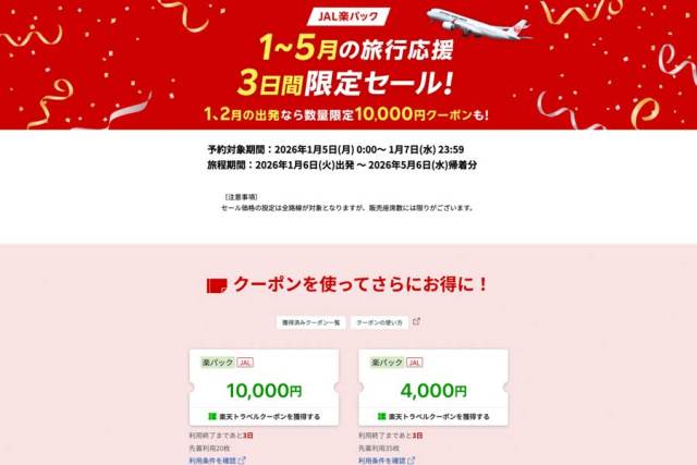 楽天グループは、旅行予約サイト「楽天トラベル」で、日本航空(JAL)のフライトと宿泊がセットになった「JAL楽パック」で1月5日から7日までセールを実施する。