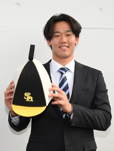 持参した荷物の中で笑顔で披露したのはSHのロゴが入ったサウナハット。昨年末に旅行した大分県内のレジャー施設でストラックアウトに挑戦。見事、パーフェクト投球で的を射抜いて景品のサウナハットをゲットした。「コントロールには自信はないが、距離が近かったので」。先発ローテ入りを目指す即戦力右腕にとって、初詣の大吉みくじとともに幸先良い戦利品? となった。