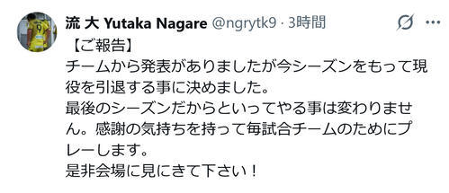 流は同日、自身のX(旧ツイッター)を更新。引退を自らの口で報告する動画を公開し、「最後のシーズンだからといってやる事は変わりません。感謝の気持ちを持って毎試合チームのためにプレーします。是非会場に見にきて下さい!」と添えた。中村も、自身のXで流同様に動画を公開。「新しい道へ挑戦したい思いが強くなった」などと決断の理由を明かし、思いを込めた。