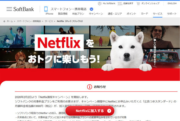 ソフトバンクは、Netflixの広告つきスタンダードプランを3カ月目まで追加料金なしで利用できるキャンペーンを開催。期間は2月2日から3月31日まで。
