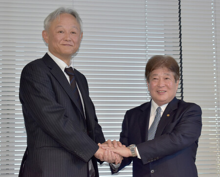 今治造船の檜垣幸人社長(右)と、同社が子会社化したジャパンマリンユナイテッド(JMU)の広瀬崇社長=6日午前、東京都港区 国内造船最大手の今治造船(愛媛県今治市)は6日、2位のジャパンマリンユナイテッド(JMU、横浜市)を子会社化する手続きが完了したと発表した。両社合わせた建造量は国内の過半となる。生産や購買で統合効果を発揮し、世界で圧倒的なシェアを握る中国・韓国勢に挑む。