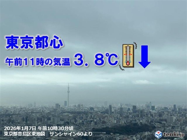 今日7日の関東は、各地とも朝から厚い雲に覆われ、関東南部の沿岸部を中心に弱い雨や雪の降っている所があります。東京都心は午前11時の気温が3.8℃と凍える寒さです。関東は午後も雲に覆われたままで、気温は上がらず真冬並みの寒さが続くでしょう。しっかり防寒を。