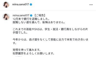 今回の投稿で「12月末で銀行を退職しました」と報告。「就職しない道を選んで、後悔はありません。これまでの芸能やSNSは、学生・就活・銀行員をしながらの片手間でした。今年からは、逃げ道をなくして芸能に全力で本気で向き合います」との思いをつづり、「覚悟を持って進みます。佐野麗奈をよろしくお願いします」と呼びかけた。
