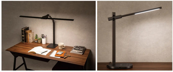 DS521Sは、スタンド式とクランプ式の2通りの設置に対応。2カ所のアーム部分の角度調節を行えば光源の高さを変更可能で、広範囲に机全体を照らしたい、手元に近い箇所を集中的に照らしたいなどシーンに合わせて調整できるという。明るさは7段階、光色は5段階で調整でき、カラーはブラック。サイズは約800(幅)×813(高さ)×193(奥行き)mm、重量は約2.33kg。
