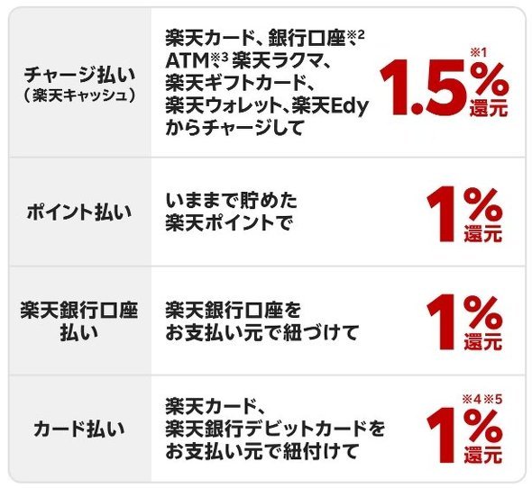 なお、楽天ペイアプリで楽天カードや楽天銀行口座を支払い元にした支払い、楽天ポイントでの支払いでのポイント還元率は、1%で変更はない。