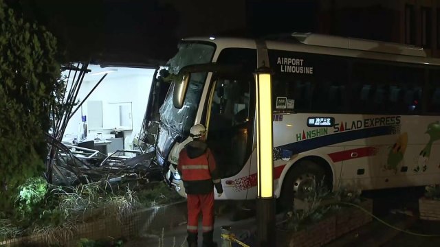 警察などによりますと、関西空港から神戸三宮駅に向かっていた阪神バスが運行するリムジンバスが、走行中に歩道に乗り上げてビルにぶつかったということです。