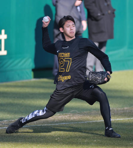 2軍施設SGLで新人合同自主トレ初日を終え「新年一発目のしっかりした練習の中でいい緊張感を持てた」。藤川監督から訓示を受けて「ケガをしないことが一番大事かなと思いました。焦らず、ゆっくりやっていきたい」。背番号3桁から支配下昇格へ、1歩ずつはい上がっていく。