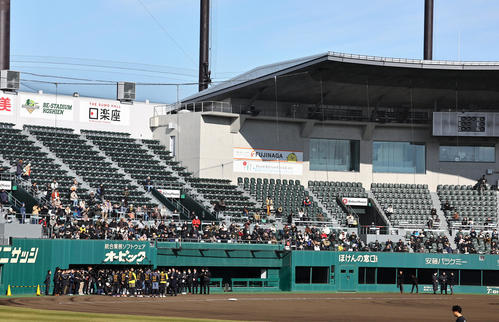 新人合同自主トレ初日はSGLのスタンドが無料開放され、約800人のファンが駆けつけた。開門時には球場正面に150人超が行列を作った。サブグラウンドの方にも約100人が集まるほどの熱気。グッズショップもオープンし、球団マスコットキャラクターのコラッキーも駆けつけルーキーの門出を盛り上げた。今後も指定日に無料開放される予定だ。