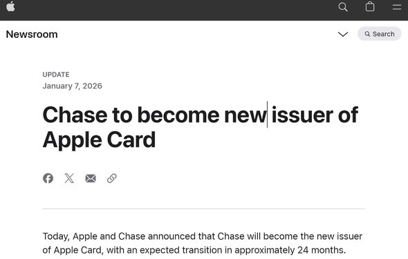 米Appleは1月7日(現地時間)、同社が提供するクレジットカードサービス「Apple Card」の新たな発行元として、米銀行最大手のJPMorgan Chase(以下「Chase」)を採用したと発表した。2019年のサービス開始から提携してきた米Goldman Sachsとの契約を解消し、パートナーシップを全面的に移行する方針だ。