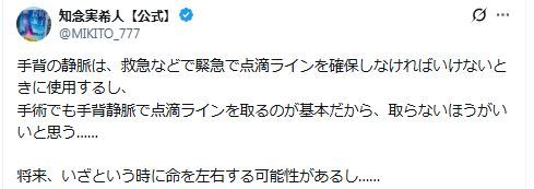 知念氏は、この投稿を引用し、「手背の静脈は、救急などで緊急で点滴ラインを確保しなければいけないときに使用するし、手術でも手背静脈で点滴ラインを取るのが基本だから、取らないほうがいいと思う……」と指摘。「将来、いざという時に命を左右する可能性があるし……」と懸念を示した。
