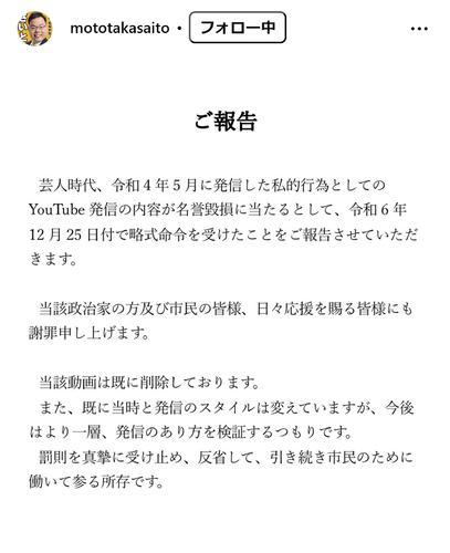 齋藤氏は「芸人時代のYouTube発信の内容が名誉毀損に当たるとして、令和7年12月25日付で略式命令を受けたことをご報告させていただきます」と伝え、「当該政治家の方及び市民の皆様、日々応援を賜る皆様にも謝罪申し上げます」とした。