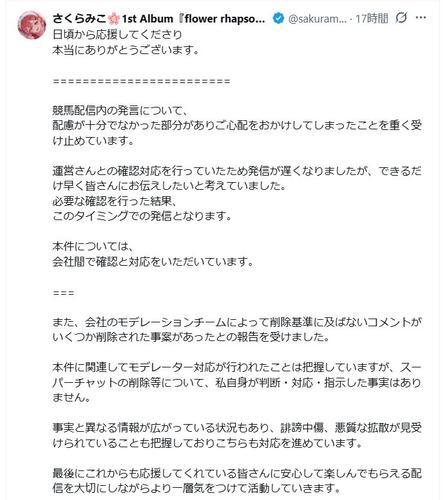 ホロライブ所属のVチューバー(バーチャルユーチューバー)さくらみこが8日までにX(旧ツイッター)を更新。競馬チャンネルの有料コンテンツを自身のライブ配信で紹介したことについて、声明を発表した。