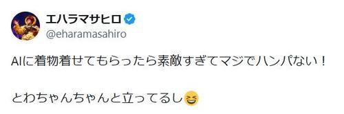 この投稿に、フォロワーから絶賛コメントが多数寄せられたが、一部からは批判的な声もあり、7日にThreadsで「エハラが只今Xでちょっと炎上しております。理由はAI使って服装を着物にしてもらったから」と言及。「そんなことにAI使うのはどうなんだ!ちゃんと写真館で撮ってやれ!とキレる方々もいらっしゃいますがみんながみんなそんな事が出来るような裕福な日本ではなくてAIに素敵な写真を作ってもらえるならば選択肢として僕はいいんじゃないかなと思う派でございます」と説明するとともに、「でもAIに色んな仕事が奪われるってのはホンマにその通りやなと思っております…凄い時代になったな…」と複雑な思いをつづっていた。