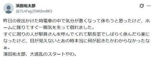 「昨日の夜出かけた時電車の中で気分が悪くなって休もうと思ったけど、ホームに降りてすぐ一瞬気を失って倒れました。すぐに周りの人が駅員さんを呼んでくれて駅長室でしばらく休んだら楽になったけど、目が見えないとあの時本当に何が起きたかわからなかったなぁ。濱田祐太郎、大波乱のスタートやわ」とポスト。別の投稿では「昨日駅のホームで気を失って倒れたときの話をしてる動画ですよかったら見てね」と前置きした上で「駅のホームで突然気を失って倒れました、目が見えないと本当に何が起きたかわからない!【濱田祐太郎】」とつづった。