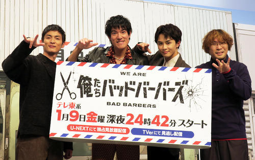 理容室を舞台にしたアクションコメディー。民放初主演に燃える中島の希望で、セットの壁紙をぶち破って登場。大暴れの寸劇を繰り広げたが、右腕をすりむくハプニング。「一発本番でいきます、と言ったら流血ですわ」と苦笑いした。草川拓弥(31)、高良健吾(38)、阪元裕吾監督(29)も登壇。