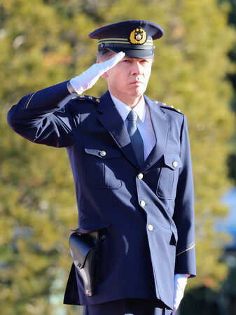 警視庁の年頭部隊出動訓練で敬礼する迫田裕治警視総監=9日午前、東京都新宿区の明治神宮外苑絵画館前 警視庁は9日朝、東京都新宿区の明治神宮外苑絵画館前で年頭部隊出動訓練を行った。迫田裕治警視総監が見守る中、約1250人の警察官と約130台の車両などが参加した。