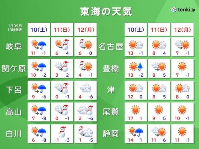 東海地方の3連休は、天気や気温変化が大きくなるでしょう。11日(日)は強い冬型の気圧配置に変わり、上空に今季最強の寒気が流れ込む見込みです。12日(月・祝)にかけて、大雪や厳しい寒さに警戒が必要です。成人の日の行事やお出かけを予定されている方は、交通機関などへの影響に注意してください。