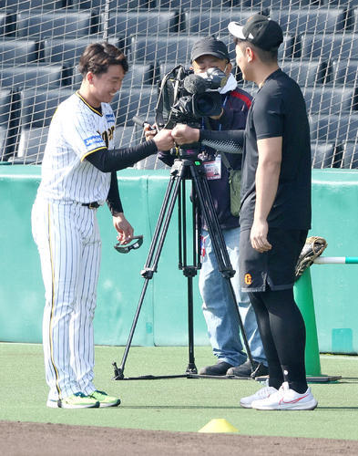 試合前の練習で阪神村上頌樹(左)は巨人岡本和真とタッチを交わす(2023年4月撮影)阪神村上頌樹投手(27)がブルージェイズへの移籍が決まった岡本の活躍を心待ちにした。